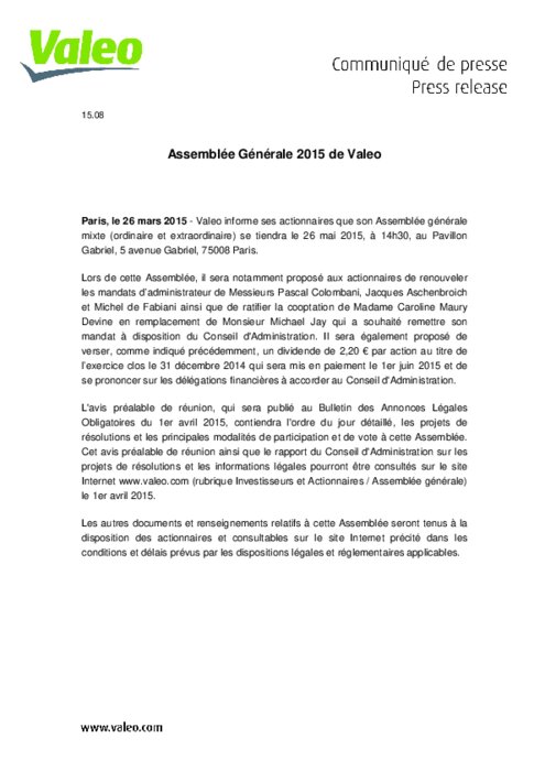 Valeo informe ses actionnaires que son Assemblée générale mixte (ordinaire et extraordinaire) se tiendra le 26 mai 2015, à 14h30, au Pavillon Gabriel, 5 avenue Gabriel, 75008 Paris. Il sera notamment proposéa aux actionnaires de renouveler les mandats d’administrateur de Messieurs Pascal Colombani, Jacques Aschenbroich et Michel de Fabiani et de ratifier la cooptation de Madame Caroline Maury Devine en remplacement de Monsieur Michael Jay.