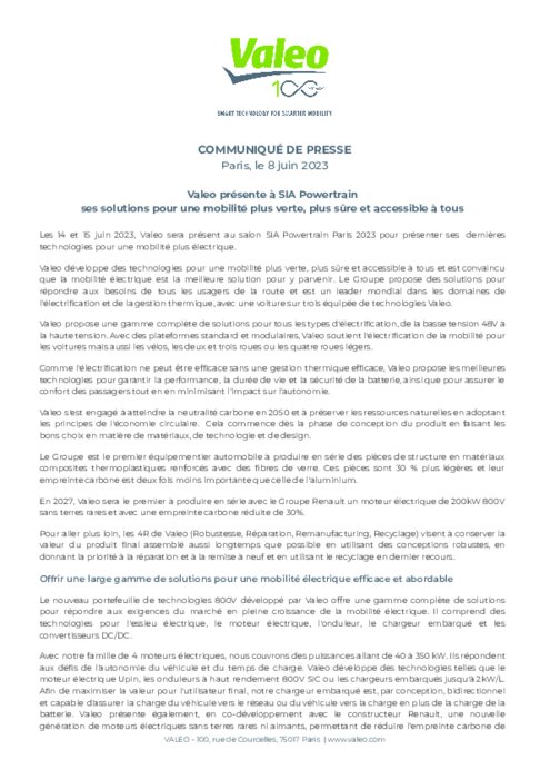 Les 14 et 15 juin 2023, Valeo sera présent au salon SIA Powertrain Paris 2023 pour présenter ses dernières technologies pour une mobilité plus électrique.