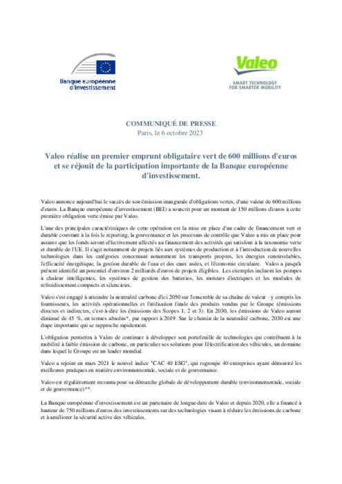 Valeo annonce aujourd'hui le succès de son émission inaugurale d'obligations vertes, d'une valeur de 600 millions d'euros. La Banque européenne d'investissement (BEI) a souscrit pour un montant de 150 millions d'euros à cette première obligation verte émise par Valeo.