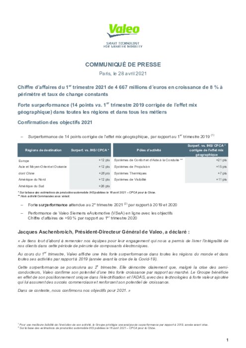 Le groupe a maintenu sa prévision de chiffre d'affaires pour 2021 de 18,2 milliards d'euros, contre 19,24 milliards d'euros en 2019 et 16,2 milliards en 2020. Valeo table toujours sur une hypothèse de croissance de 10% de la production automobile mondiale. Les "perturbations d'approvisionnement" et "la hausse du prix de certaines matières premières" devraient avoir des conséquences limitées à environ 80 millions d'euros.