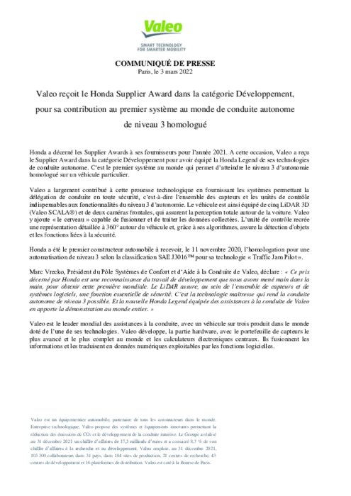 Constructeurs, Equipementiers 03 mars 2022 - 08:30 Valeo reçoit le Honda Supplier Award dans la catégorie Développement, pour sa contribution au premier système au monde de conduite autonome de niveau 3 homologué. PDF (212 Ko) Télécharger