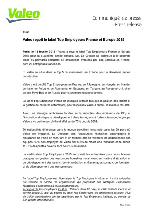 Valeo a reçu le label Top Employeurs France et Europe 2015 pour la quatrième année consécutive. Le Groupe se distingue à la seconde place du palmarès comptant 58 entreprises évaluées par Top Employeurs France, dont 27 entreprises françaises. Et Valeo se situe dans le top 5 du classement en France pour la deuxième année consécutive.