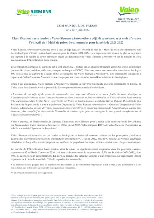 Valeo Siemens eAutomotive annonce avoir d’ores et déjà dépassé l’objectif de plus de 4 Mds€ de prises de commandes pour des technologies d’électrification haute tension, pour la période 2021-2022. Cela représente une avance de plus de sept mois par rapport à la feuille de route annoncée, signe du dynamisme de Valeo Siemens eAutomotive sur le marché en forte accélération de l’électrification haute tension.