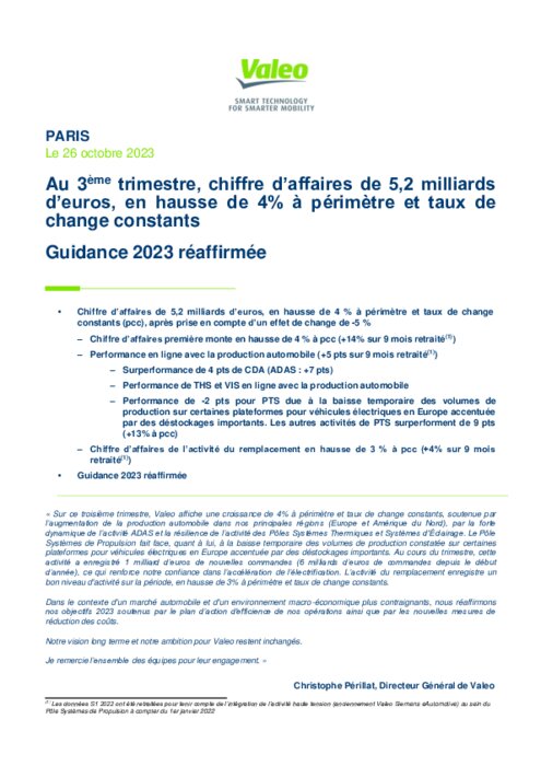 Au troisième trimestre, le chiffre d'affaires du pôle système de propulsion s'est lui contracté de 2% à cause de "la baisse temporaire des volumes de production constatées sur certaines plateformes pour véhicules électriques en Europe accentuée par des déstockages importants", détaille le communiqué.