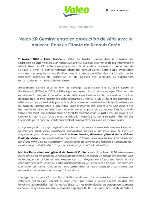 Valeo, un leader mondial dans le domaine des technologies automobiles, a annoncé aujourd'hui que son expérience de jeu innovante en réalité étendue (XR) entrera en production de série dans le cadre du lancement de Renault Filante, le dernier véhicule phare de Renault Corée. Cette étape importante marque une progression significative dans la stratégie de Valeo visant à transformer les capacités avancées de perception et de logiciels des véhicules en expériences embarquées enrichies et différenciantes.