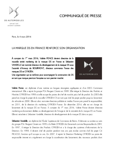 À compter du 1er mars 2016, Valérie PONCE devient directrice de la nouvelle entité marketing de la marque DS en France et Sébastien VANDELLE est nommé directeur du développement de la marque DS sous l’autorité d’Amaury de BOURMONT, directeur commerce France des marques DS et CITROËN. Une organisation qui se renforce pour accompagner la construction de DS en tant que marque premium française sur son premier marché.