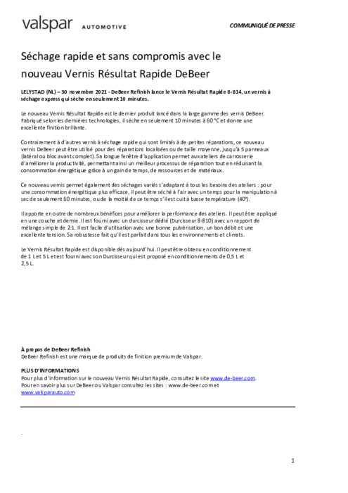 Valspar Automotive : nouveau Vernis Résultat Rapide 8-814 de DeBeer