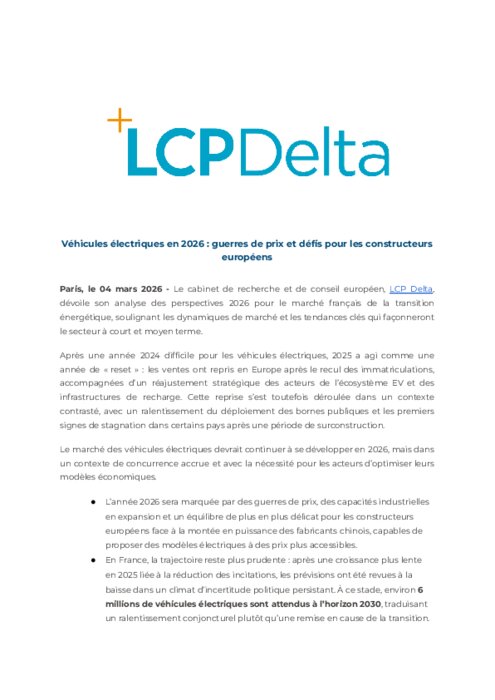 Le cabinet de recherche et de conseil européen, LCP Delta, dévoile son analyse des perspectives 2026 pour le marché français de la transition énergétique, soulignant les dynamiques de marché et les tendances clés qui façonneront le secteur à court et moyen terme.