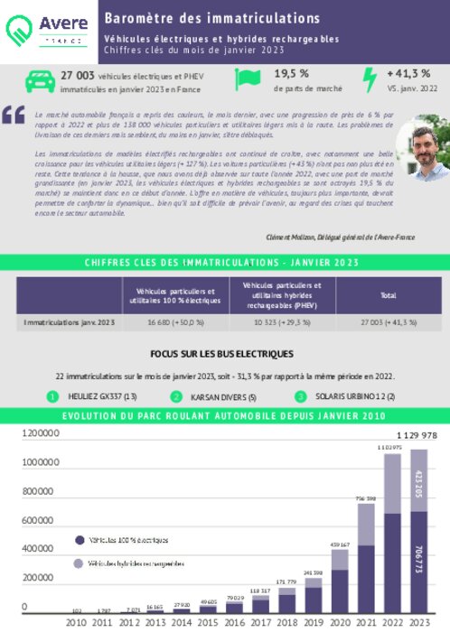 Les immatriculations de véhicules électriques et hybrides rechargeables ont progressé de + 41,5 % en janvier 2023, par rapport à l’an passé. L’année démarre bien, donc, mais il convient de rester vigilent : les crises qui impactent le marché automobile (pénurie de semi-conducteurs, problèmes de livraisons…) ne sont pas terminées.