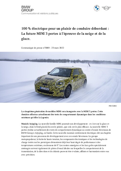 Constructeurs 23 mars 2022 - 10:02 La cinquième génération de modèles MINI sera inaugurée avec la MINI 3 portes. Cette dernière effectue actuellement des tests de comportement dynamique dans les conditions extrêmes qu'offre la Laponie. PDF (352 Ko) Télécharger