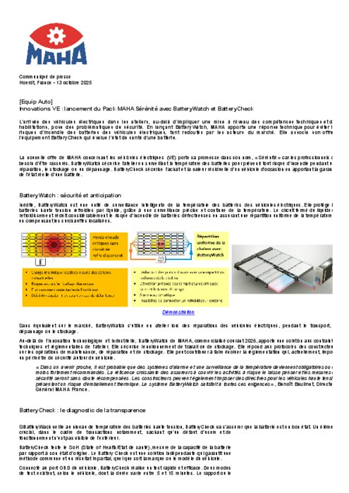 L’arrivée des véhicules électriques dans les ateliers, au-delà d’impliquer une mise à niveau des compétences techniques et des habilitations, pose des problématiques de sécurité. En lançant BatteryWatch, MAHA apporte une réponse technique pour éviter les risques d’incendie des batteries des véhicules électriques, tant redoutés par les acteurs du marché. Elle associe son offre à l’équipement BatteryCheck qui évalue l’état de santé d’une batterie.