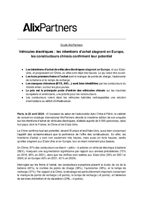 A l’occasion du salon de l’automobile Auto China qui se tient en ce moment à Pékin, le cabinet de conseil en stratégie international AlixPartners dévoile la troisième édition de son enquête sur les intentions d’achat de véhicules électriques, réalisée auprès de 9 000 personnes, dans huit pays, dont la France, la Chine et les Etats-Unis.