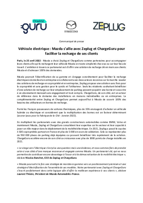 Mazda a choisi Zeplug et ChargeGuru comme partenaires pour accompagner leurs clients afin qu’ils rechargent leur véhicule Mazda en toute simplicité chez eux ou sur leur lieu de