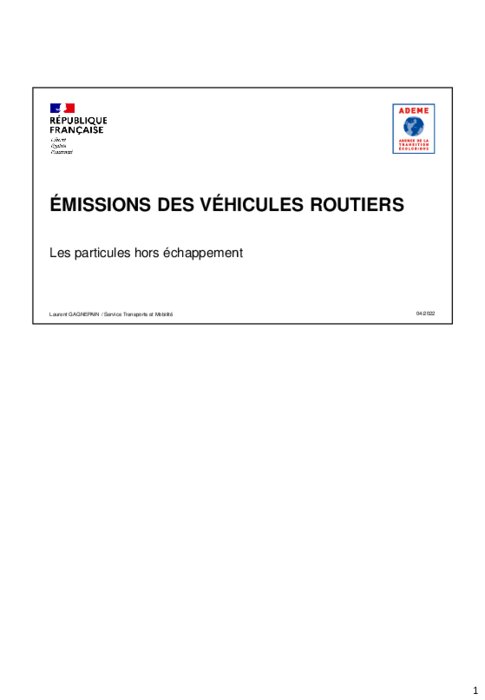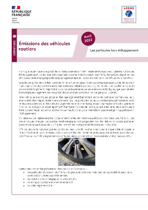 Alors que les émissions de particules à l’échappement ont nettement baissé avec la généralisation des filtres à particules, celles hors échappement provenant de l’abrasion des freins, des pneumatiques et des chaussées deviennent prépondérantes et représentent en France en 2019, plus de la moitié des particules émises par les transports routiers. Si les VE, émettent moins de particules de frein que les véhicules thermiques, elles émettent plus de particules provenant du contact pneu-chaussée...
