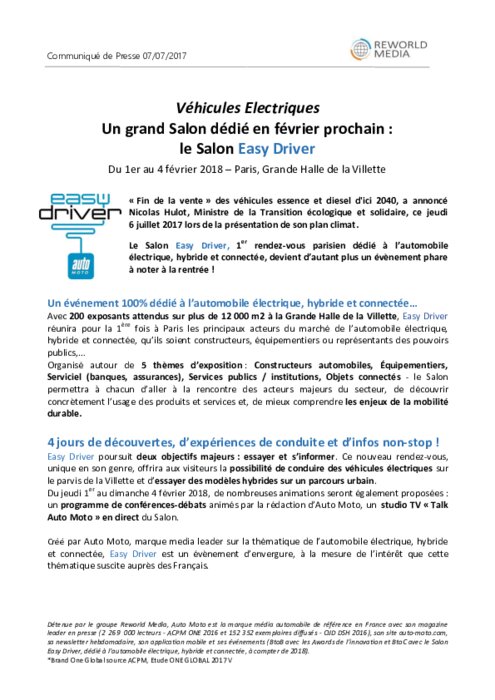 " Fin de la vente " des véhicules essence et diesel d'ici 2040, a annoncé Nicolas Hulot, Ministre de la Transition écologique et solidaire, ce jeudi 6 juillet 2017 lors de la présentation de son plan climat. Le Salon Easy Driver, 1er rendez-vous parisien dédié à l’automobile électrique, hybride et connectée, devient d’autant plus un événement phare à noter à la rentrée !