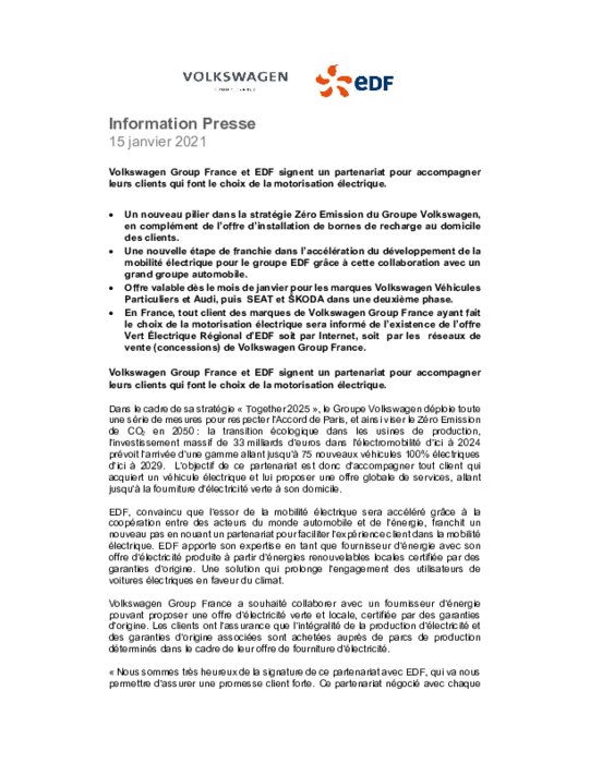 Volkswagen Group France et EDF signent un partenariat pour accompagner leurs clients qui font le choix de la motorisation électrique. Dans le cadre de sa stratégie « Together 2025 », le Groupe Volkswagen déploie toute une série de mesures pour respecter l’Accord de Paris, et ainsi viser le Zéro Emission de CO2 en 2050 : la transition écologique dans les usines de production, l’investissement massif de 33 milliards d’euros dans l’électromobilité d’ici à 2024...