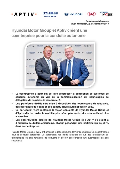 Hyundai et Aptiv ont annoncé le 23 septembre dernier la création d’une coentreprise pour la conduite autonome. Ce partenariat voit naître l’alliance de l'un des fournisseurs de technologies les plus novateurs de l'industrie et de l'un des constructeurs automobiles les plus importants.