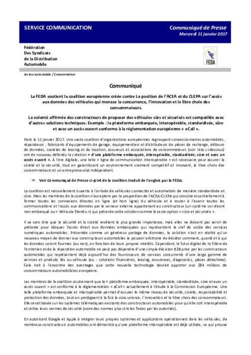 La coalition est ouverte à l’arrivée de véhicules connectés et automatisés de manière standardisée et sûre. Mais les membres de la coalition n’acceptent pas la proposition de l’ACEA-CLEPA qui consiste essentiellement à fermer toutes les connexions directes en ligne (et hors ligne) du véhicule et à router à l’avenir toutes les communications et l’accès aux données par le serveur externe appartenant au constructeur qui présente cette solution comme la seule option "sûre et sécurisée".