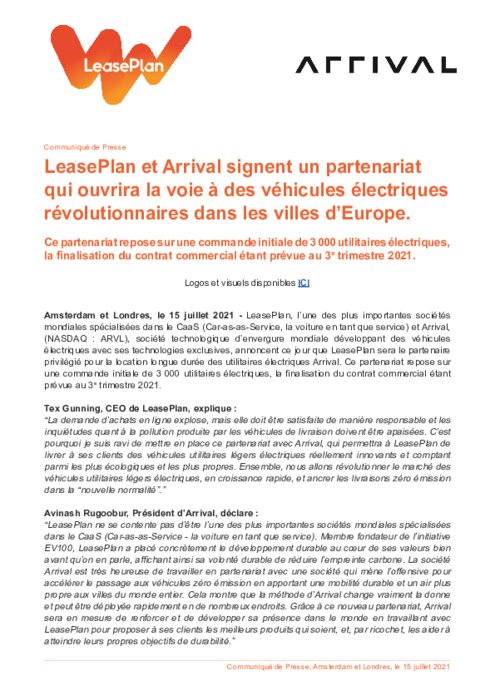 LeasePlan, l’une des plus importantes sociétés mondiales spécialisées dans le CaaS (Car-as-as-Service, la voiture en tant que service) et Arrival, société technologique d'envergure mondiale développant des véhicules électriques avec ses technologies exclusives, annoncent ce jour que LeasePlan sera le partenaire privilégié pour la location longue durée des utilitaires électriques Arrival. Ce partenariat repose sur une commande initiale de 3 000 utilitaires électriques...