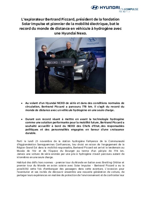Parti le lundi 25 novembre de la station hydrogène FaHyence de la Communauté d'Agglomération Sarreguemines Confluences, lieu choisi en raison de l’engagement de la Région Grand Est dans la mobilité responsable, Bertrand Piccard est arrivé le lendemain au Musée de l’Air et de l’Espace du Bourget au terme d’un périple de 778 km. Jamais une voiture de série animée par une pile à hydrogène n’avait parcouru autant de kilomètres en une seule charge.
