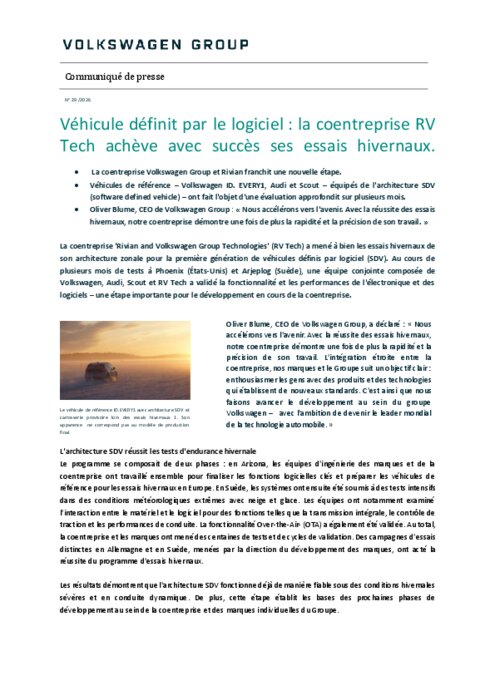 La coentreprise 'Rivian and Volkswagen Group Technologies' (RV Tech) a mené à bien les essais hivernaux de son architecture zonale pour la première génération de véhicules définis par logiciel (SDV). Au cours de plusieurs mois de tests à Phoenix (États-Unis) et Arjeplog (Suède), une équipe conjointe composée de Volkswagen, Audi, Scout et RV Tech a validé la fonctionnalité et les performances de l'électronique et des logiciels – une étape importante pour le développement en cours de la coentreprise.