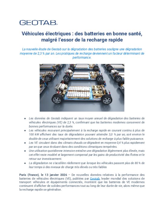 De nouvelles données relatives à la performance des batteries de véhicules électriques (VE), publiées par Geotab, leader mondial des solutions de transport véhicules et équipements connectés, montrent que les batteries de VE modernes continuent d’afficher de solides performances tout au long de leur durée de vie, alors même que la recharge rapide se généralise. Dans le cadre de l’actualisation de cette étude sur l’état des batteries de VE, Geotab a analysé des données réelles issues de plus de 22 700 véhicules électriques, parmi 21 marques et modèles, sur la base de plusieurs années de données télématiques agrégées. Cette nouvelle analyse révèle un taux moyen annuel de dégradation des batteries de 2,3 %, contre 1,8 % dans les résultats publiés par Geotab en 2024.