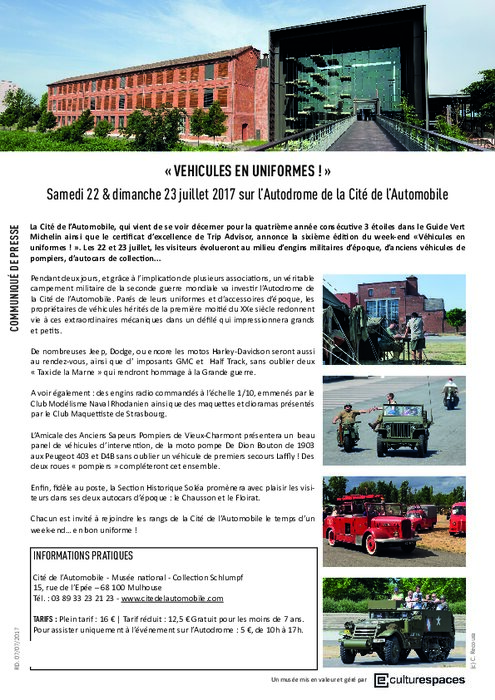 La Cité de l’Automobile, qui vient de se voir décerner pour la quatrième année consécutve 3 étoiles dans le Guide Vert Michelin ainsi que le certificat d’excellence de Trip Advisor, annonce la sixième édition du week-end " Véhicules en uniformes ! ". Les 22 et 23 juillet, les visiteurs évolueront au milieu d’engins militaires d’époque, d’anciens véhicules de pompiers, d’autocars de collection..