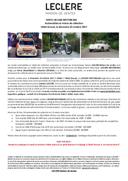 Les ventes automobiles et motos de collection proposées à Drouot par la dynamique maison LECLERE-Maison de ventes sont maintenant devenues un rendez-vous incontournable à Paris. En deux ans son département mécanique, LECLERE MOTORCARS dirigé par Pierre DELAGNEAU et Maxime LÉPISSIER, a su faire de cette exclusivité, un rendez-vous parisien de qualité où se retrouvent les collectionneurs et passionnés venus en famille.