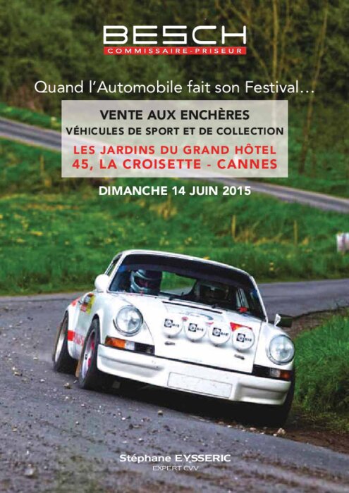 La vente de véhicules de sport et de collection dans les jardins du Grand Hôtel (45, La croisette à Cannes) organisées le 14 juin prochain par la maison de ventes Besch. Belle réunion de 4 Porches provenant d'un grand collectionneur privé (n° 17-16-15-14) dont notamment une Porsche 911 2.7L RS Touring « ex-usine » de 1973 (estimation 650 000/850 000 €).
