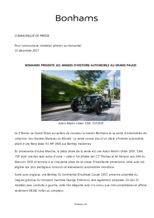 Le Grand Palais accueillera de nouveau la maison Bonhams et sa vente d’automobiles de collection ‘Les Grandes Marques du Monde.’ La vente couvre plus d’un siècle d’histoire automobile, allant d’une Benz Idéal 4.5 HP 1900 aux Bentley modernes. En provenance d’outre-Manche, la pièce phare de la vente est une Aston Martin Ulster 1935. ‘CML 719’ était une des sept autos d’usine – celle-ci fut pilotée par C.T Thomas et M. Kenyon aux 24H du Mans en 1935 et termina à la cinquième place de sa classe.