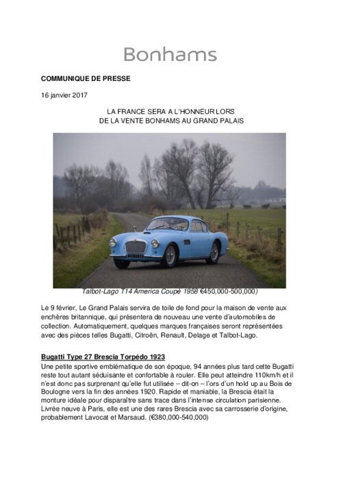 Le 9 février, Le Grand Palais servira de toile de fond pour la maison de vente aux enchères britannique, qui présentera de nouveau une vente d’automobiles de collection. Automatiquement, quelques marques françaises seront représentées avec des pièces telles Bugatti, Citroën, Renault, Delage et Talbot-Lago.
