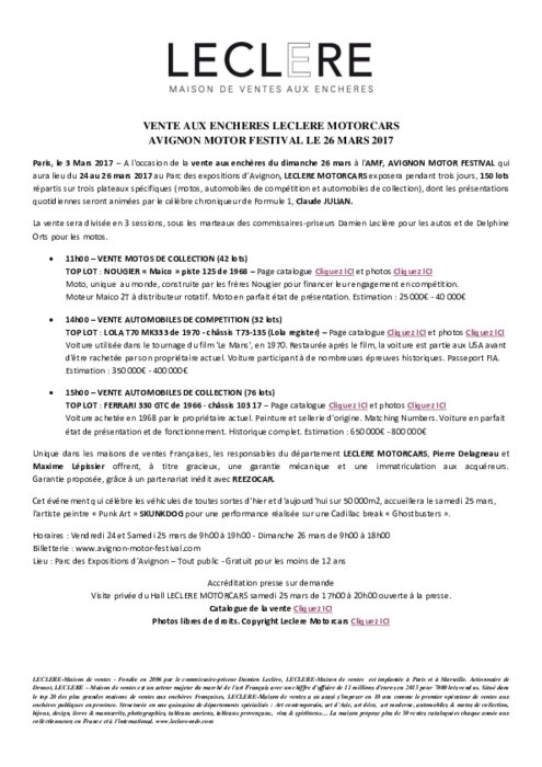 A l'occasion de la vente aux enchères du dimanche 26 mars à l'AMF, AVIGNON MOTOR FESTIVAL qui aura lieu du 24 au 26 mars 2017 au Parc des expositions d’Avignon, LECLERE MOTORCARS exposera pendant trois jours, 150 lots répartis sur trois plateaux spécifiques (motos, automobiles de compétition et automobiles de collection), dont les présentations quotidiennes seront animées par le célèbre chroniqueur de Formule 1, Claude Julian.