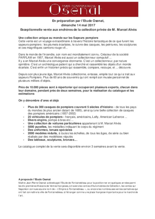 Services 27 mars 2017 - 14:29 Cette vente est un voyage extraordinaire à travers l'histoire fantastique de ce que furent les sapeurs-pompiers : les plumets écarlates, le cuivre des casques, les peintures, les sculptures et ces magnifiques camions rouge vif... PDF (29 Ko) Télécharger PDF (14 Mo) Télécharger