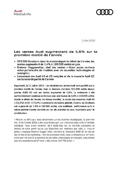 Les résultats des ventes Audi sont positifs sur la première moitié de l’année. Avec la livraison d’environ 953 200 unités depuis janvier, AUDI voit ses ventes augmenter de 5,6%. La croissance a été particulièrement soutenue en Europe avec une hausse de 8,4% à 450 000 unités depuis le début de l’année. Au niveau mondial, le succès des nouvelles Audi A4 (+12,3%) et Q7 (+73,6%) a soutenu la croissance globale.