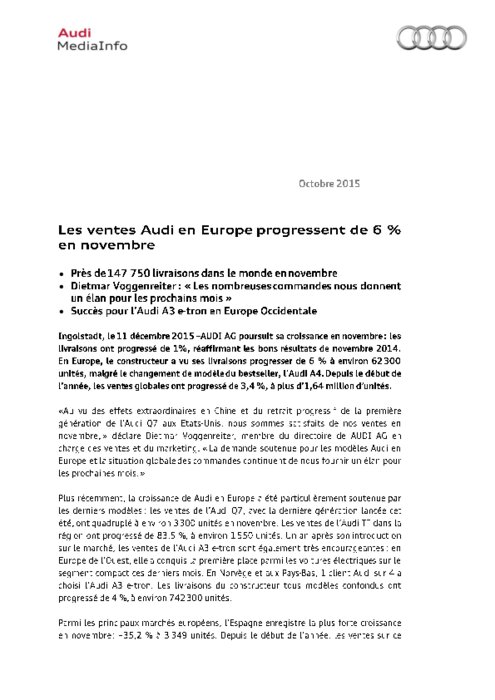 AUDI poursuit sa croissance en novembre : les livraisons ont progressé de 1%, réaffirmant les bons résultats de novembre 2014. En Europe, le constructeur a vu ses livraisons progresser de 6 % à environ 62 300 unités, malgré le changement de modèle du bestseller, l’Audi A4. Depuis le début de l’année, les ventes globales ont progressé de 3,4 %, à plus d’1,64 million d’unités.