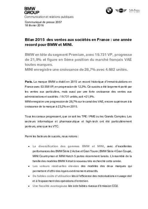 La marque BMW a établi en 2015 un record historique d’immatriculations en France avec 53.558 VP, en progression de 12,3%. Ce succès a été largement porté par les ventes aux particuliers, mais aussi par une forte croissance des ventes aux administrations et sociétés : 19.731 unités, soit +21,9%.