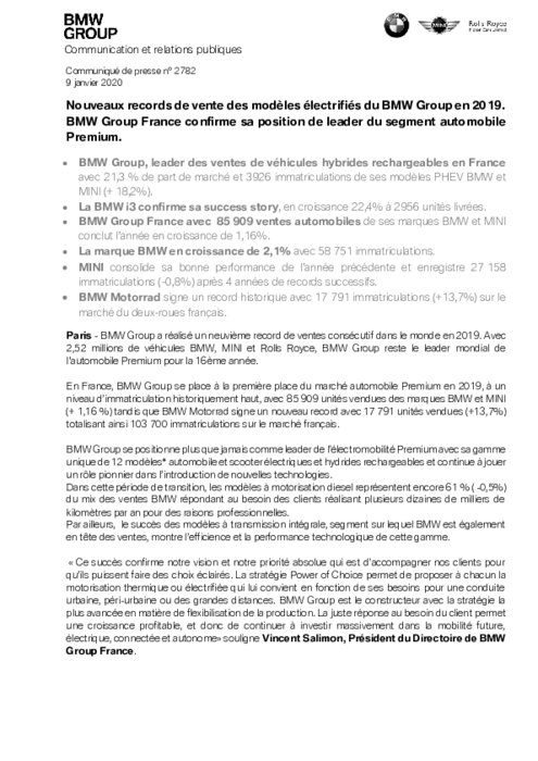BMW Group a réalisé un neuvième record de ventes consécutif dans le monde en 2019. Avec 2,52 millions de véhicules BMW, MINI et Rolls Royce, BMW Group reste le leader mondial de l'automobile Premium pour la 16ème année. En France, BMW Group se place à la première place du marché automobile Premium en 2019, à un niveau d’immatriculation historiquement haut, avec 85 909 unités vendues des marques BMW et MINI (+ 1,16 %) tandis que BMW Motorrad signe un nouveau record avec 17 791 unités vendues...