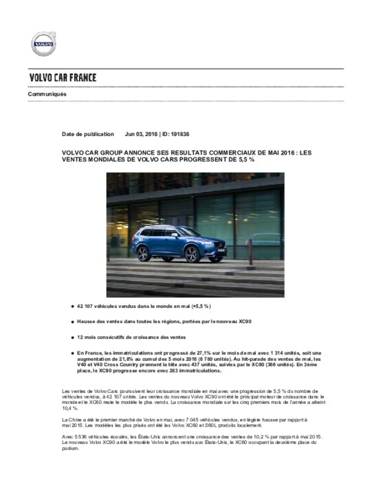 Les ventes de Volvo Cars poursuivent leur croissance mondiale en mai avec une progression de 5,5 % du nombre de véhicules vendus, à 42 107 unités. Les ventes du nouveau Volvo XC90 ont été le principal moteur de croissance dans le monde et le XC60 reste le modèle le plus vendu. La croissance mondiale sur les cinq premiers mois de l’année a atteint 10,4 %.
