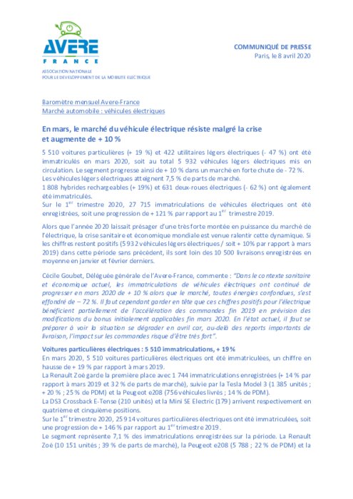 5 510 voitures particulières (+ 19 %) et 422 utilitaires légers électriques (- 47 %) ont été immatriculés en mars 2020, soit au total 5 932 véhicules légers électriques mis en circulation. Le segment progresse ainsi de + 10 % dans un marché en forte chute de - 72 %. Les véhicules légers électriques atteignent 7,5 % de parts de marché. 1 808 hybrides rechargeables (+ 19%) et 631 deux-roues électriques (- 62 %) ont également été immatriculés.