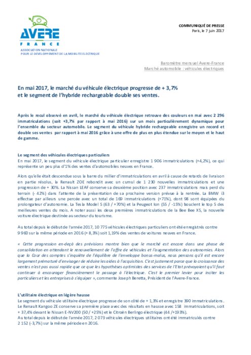 Après le recul observé en avril, le marché du véhicule électrique retrouve des couleurs en mai avec 2 296 immatriculations (soit +3,7% par rapport à mai 2016) sur un mois particulièrement dynamique pour l'ensemble du secteur automobile. Le segment du véhicule hybride rechargeable enregistre un record et double ses ventes par rapport à mai 2016 grâce à une offre de plus en plus étendue sur le moyen et le haut de gamme.