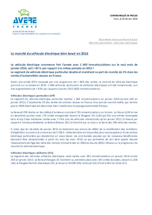 Le véhicule électrique commence fort l'année avec 1 669 immatriculations sur le seul mois de janvier 2016, soit + 85 % par rapport à la même période en 2015 !
