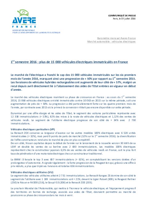 Le marché de l'électrique a franchi le cap des 15 000 véhicules immatriculés sur les six premiers mois de l'années 2016, marquant ainsi une progression de +50% par rapport au premier semestre 2015. Les livraisons de véhicules hybrides ont augmenté de leur coté de +57%, malgré un recul depuis avril directement lié à l'abaissement des aides de l'état entrées en vigueur en début d'année.