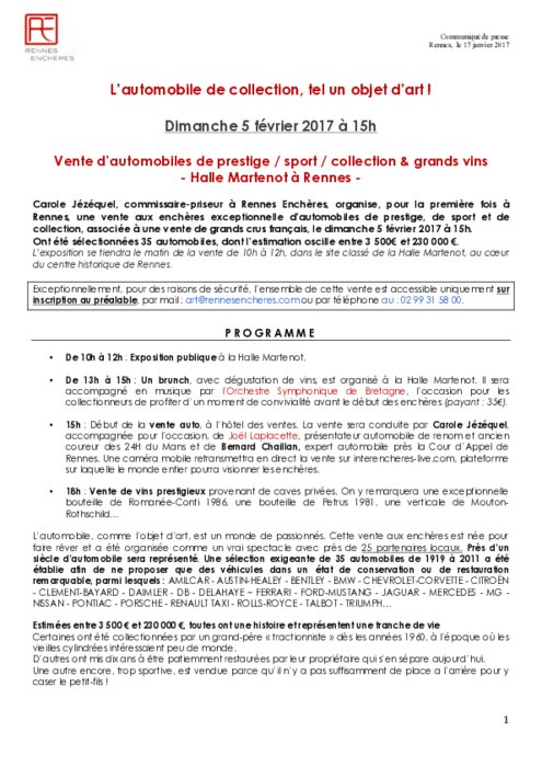 Carole Jézéquel, commissaire-priseur à Rennes Enchères, organise, pour la première fois à Rennes, une vente aux enchères exceptionnelle d’automobiles de prestige, de sport et de collection, associée à une vente de grands crus français, le dimanche 5 février 2017 à 15h. Ont été sélectionnées 35 automobiles, dont l’estimation oscille entre 3 500€ et 230 000 €.