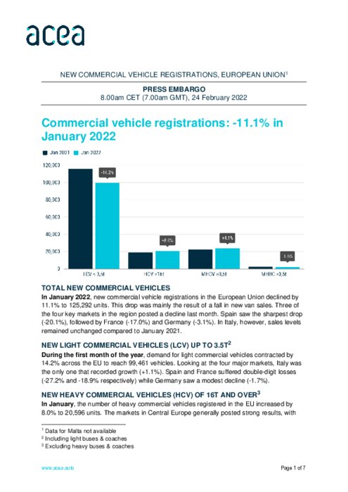 En janvier 2022, les immatriculations de véhicules utilitaires neufs dans l'Union européenne ont diminué de 11,1 % pour atteindre 125 292 unités. Cette baisse est principalement le résultat d'une chute des ventes de fourgonnettes neuves.