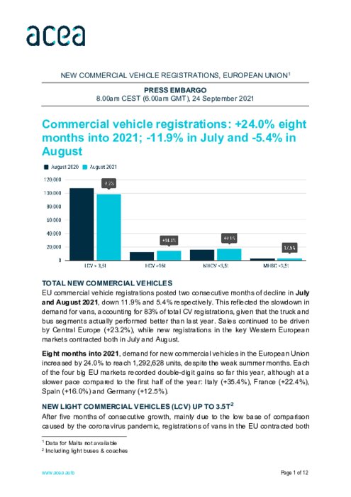 Constructeurs 27 septembre 2021 - 08:00 Les immatriculations de véhicules commerciaux de l’UE ont affiché deux mois consécutifs de baisse en juillet et août 2021, en baisse de 11,9 % et de 5,4 % respectivement. Voir le communiqué détaillé de l'ACEA ci-dessous (en anglais) PDF (2 Mo) Télécharger