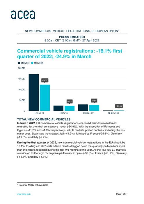 En mars 2022, les immatriculations de véhicules utilitaires dans l'UE ont poursuivi leur tendance à la baisse, reculant pour le neuvième mois consécutif (-24,9%). À l'exception de la Roumanie et de Chypre (respectivement +11,2% et +1,6%), tous les marchés de l'UE ont affiché des baisses, y compris les quatre principaux. L'Espagne a connu la plus forte baisse (-41,2%), suivie de la France (-25,9%), de l'Allemagne (-19,6%) et de l'Italie (-9,7%)...