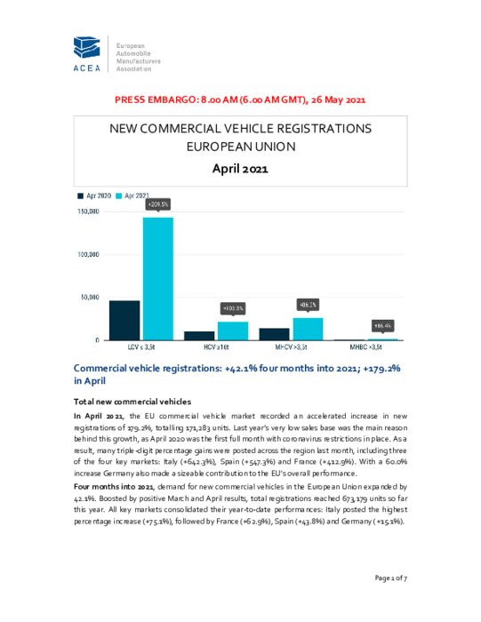 En avril 2021, le marché des véhicules utilitaires de l’UE a enregistré une augmentation accélérée des nouvelles immatriculations de 179,2 %, pour un total de 171283 unités. La très faible base de ventes de l’an dernier était la principale raison de cette croissance, car avril 2020 était le premier mois complet avec des restrictions sur le coronavirus en place.