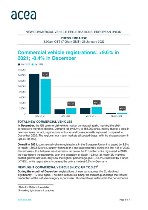 En décembre, le marché européen des véhicules utilitaires s'est à nouveau contracté, marquant le sixième mois consécutif de baisse. La demande a chuté de 8,4 %, à 155 963 unités, principalement en raison d'une baisse des ventes de fourgonnettes neuves. En réalité, les immatriculations de camions et d'autobus ont progressé par rapport à décembre 2020. Les quatre principaux marchés de la région ont tous enregistré des baisses...