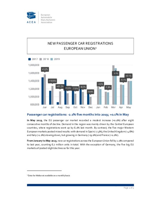 Sur les cinq premiers mois de l'année, l'Allemagne (+1,7%) est le seul des cinq grands marchés nationaux à progresser. Sur l'ensemble de l'Union européenne, les immatriculations sont en baisse de 2,1% de janvier à mai.