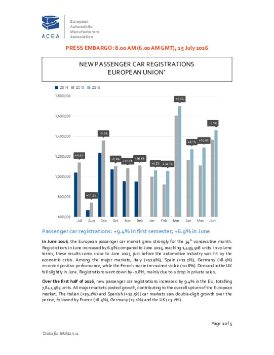 Les +6,9% de juin signalent une baisse de rythme par rapport au début de l'année, mais la croissance du marché européen reste solide sur le premier semestre, à 9,4%, presque le double du pronostic de l'ACEA (+5%) pour 2016.